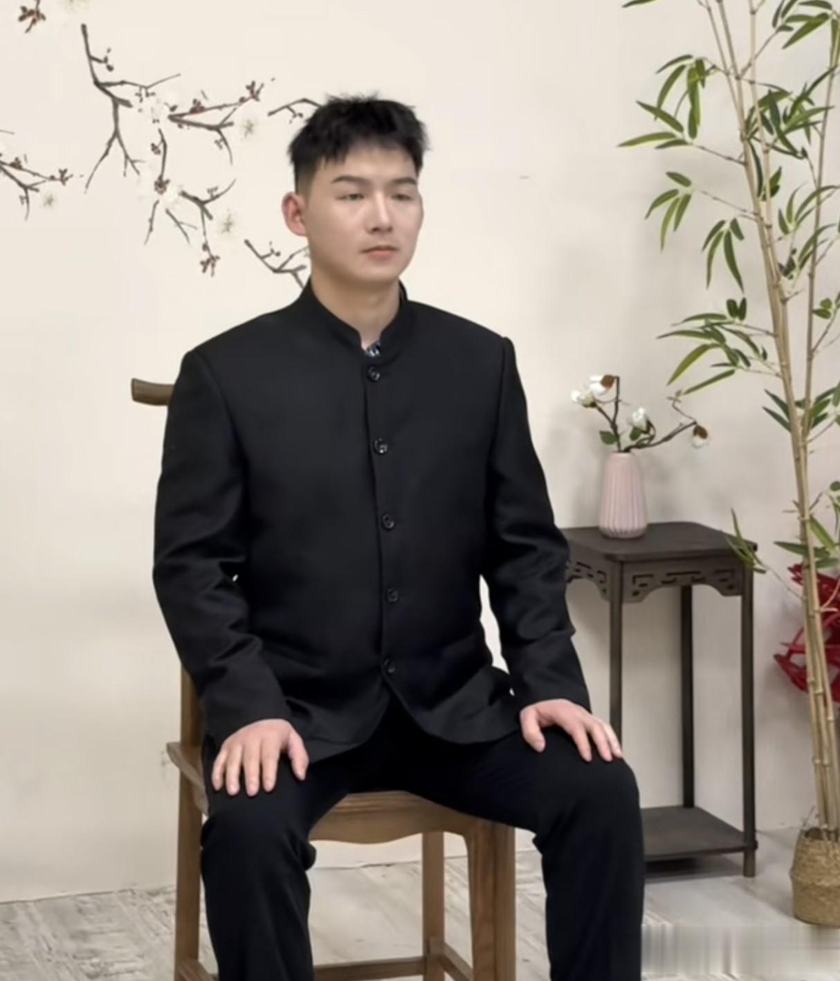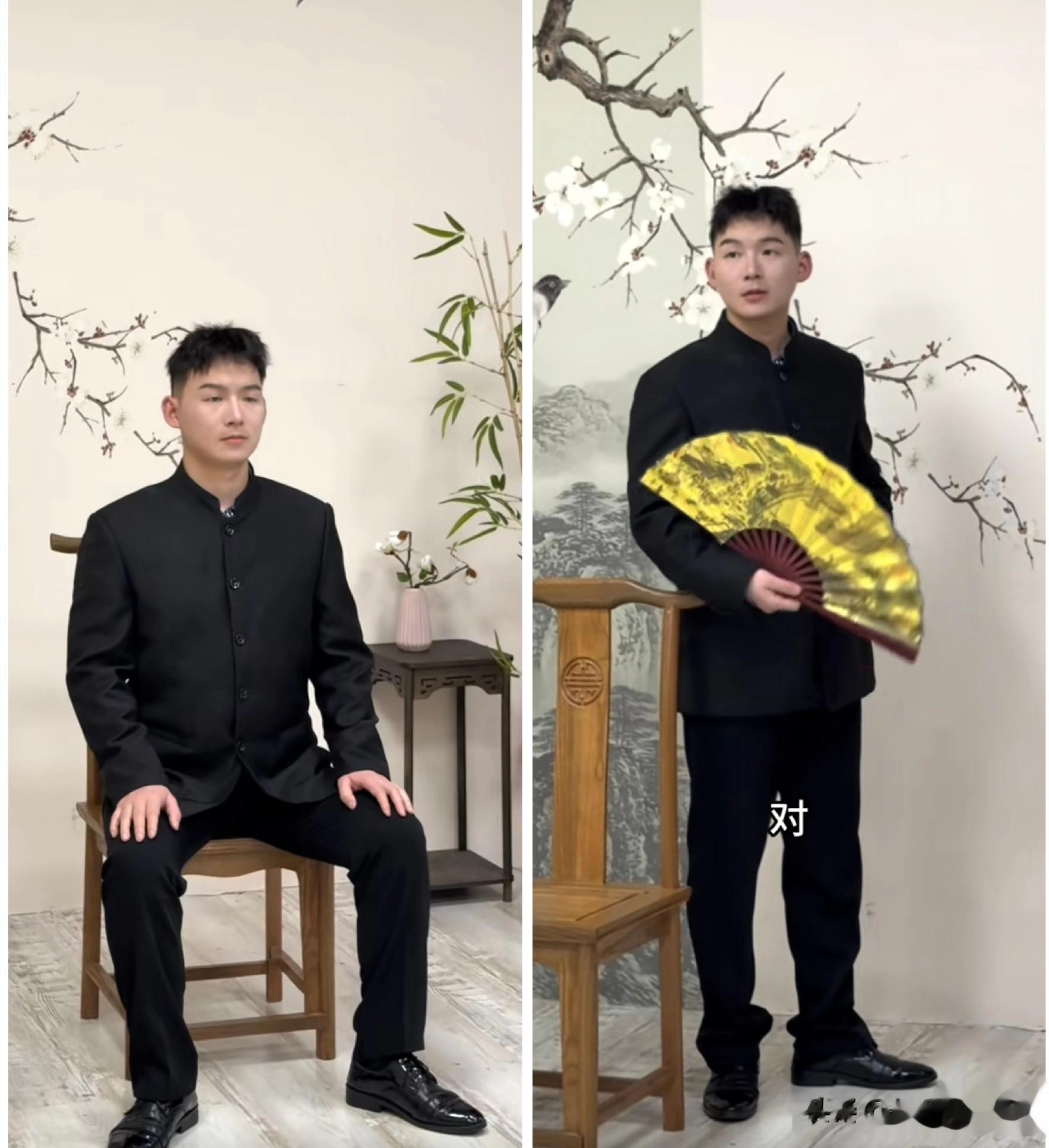 他一改往日运动服装的打扮,选择了一身黑色的中山装,脚上的皮鞋更是增光瓦亮,手里拿着一把黄色的折扇。