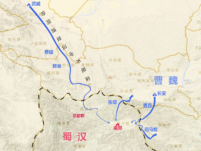 至于上文为何说到曹魏是至少兵分三路伐蜀,这是由于武威郡可能也有发兵伐蜀。但是武威郡位于凉州,离汉中的距离是其他3条路线的3倍有余,并且中间有武都郡阻隔,无法实现协同会战汉中。