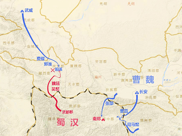 在公元229年时,诸葛亮派陈式等人占据了武都、阴平郡。对于从武威南下而来的费耀与郭淮,由魏延、吴懿负责抵御。