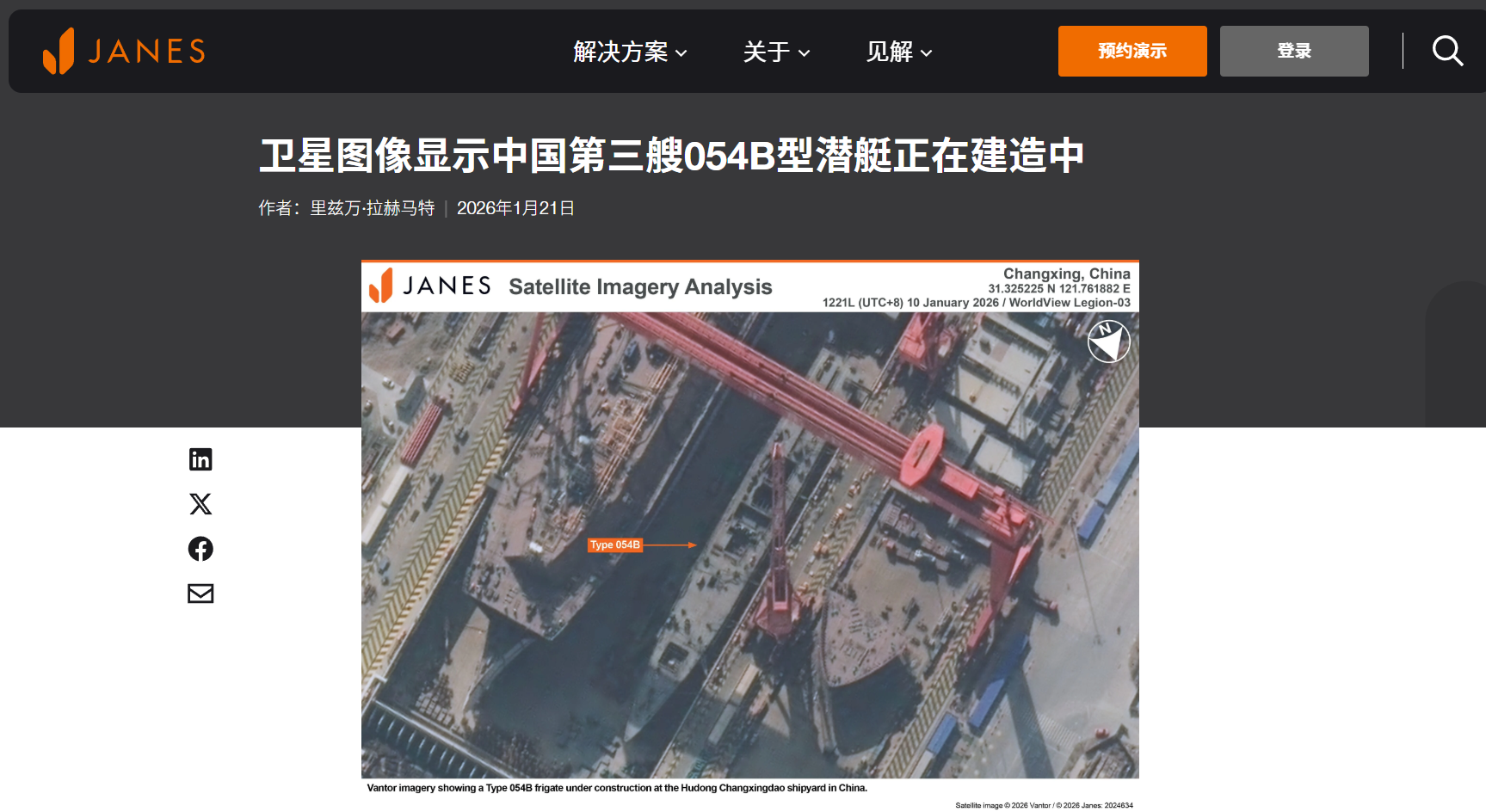 据简氏防务周刊网站1月21日报道,在1月10日拍摄并开源的商业卫星照片中,一艘新型导弹护卫舰出现在上海沪东中华造船厂位于长兴岛新生产基地的干船坞内,旁边是一艘LNG液化天然气运输船的船体。