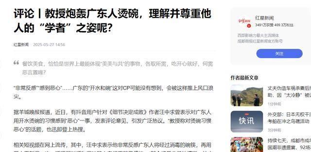 红星新闻:2025-05-27《评论|教授炮轰广东人烫碗,理解并尊重他人的“学者”之姿呢?》
