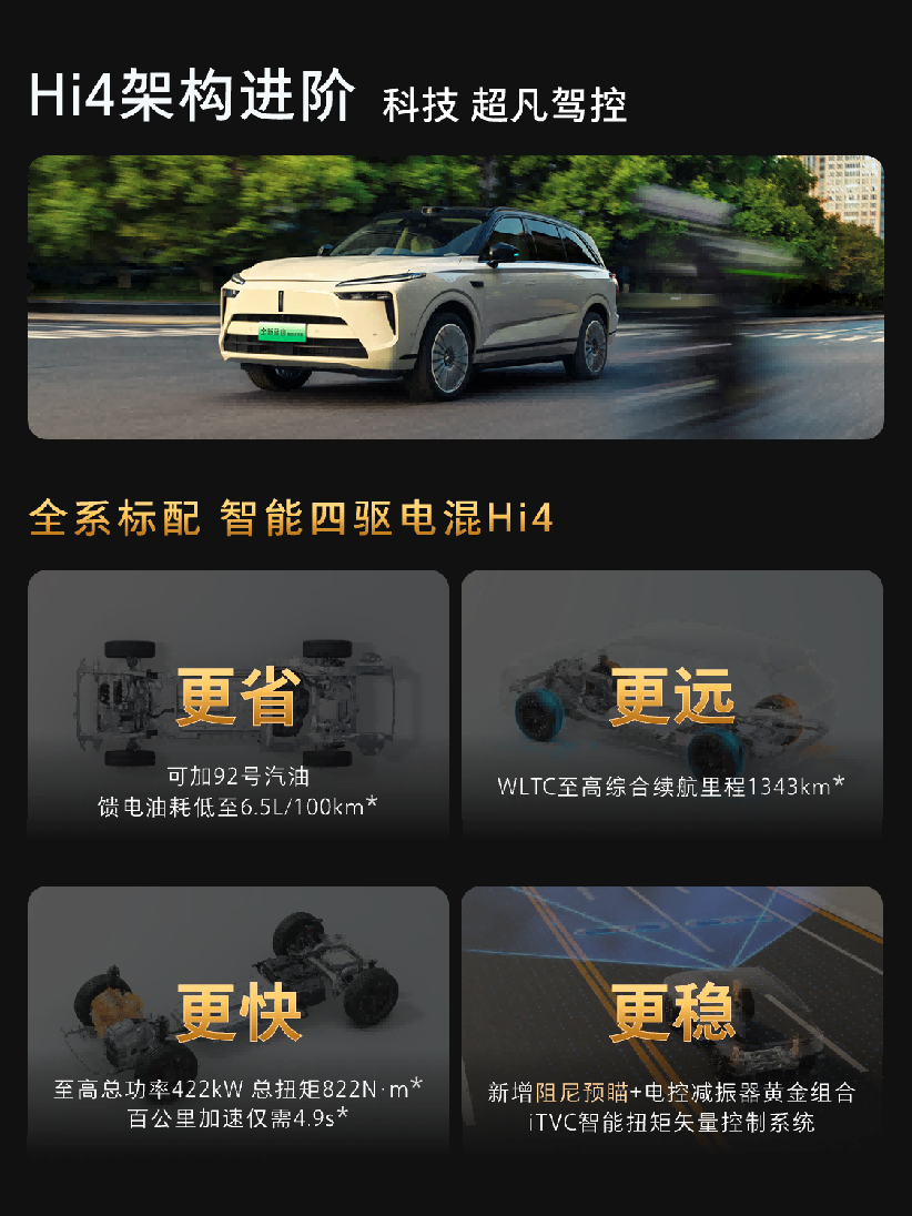 Hi4性能版,是全球首创的四挡全速域直驱技术。在路上的表现可概括为:跑得省、跑得远、跑得快、跑得稳。在4.9秒零百加速性能的同时,还能达成6.5L/100km的超低馈电油耗,更能带来1343km综合续航。并通过前后50:50轴荷分配与iTVC智能扭矩控制,为全家出行提供了从容安稳的驾乘体验。真正实现了“四驱的性能,两驱的花费”。