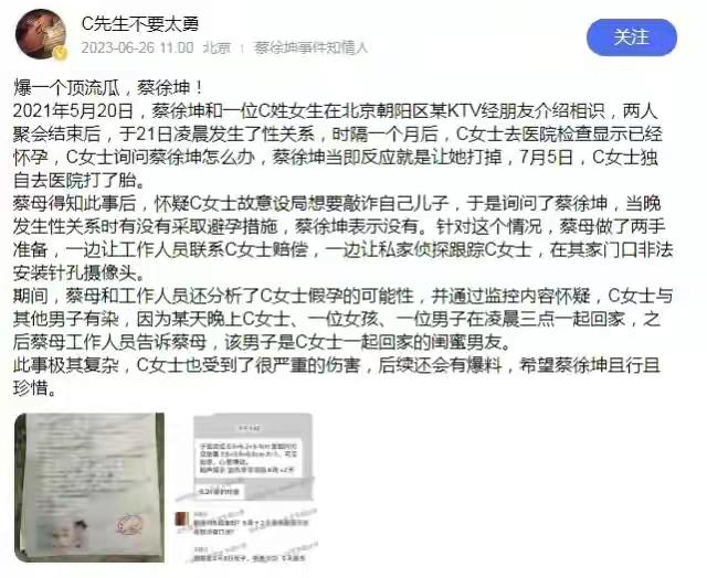 最近有消息称,蔡徐坤在北京朝阳区某KTV认识了一位姓C的女孩,据说他们有一夜情,导致女方怀孕。6月26日上午11点17分,江小宴在直播中爆料了这个消息,引起了网络上的热议。江小宴还提到,蔡徐坤的母亲徐某为了跟踪C女士,在她家门口安装了针孔摄像头,并在群组聊天中分享所拍视频。据说,蔡徐坤的母亲怀疑女方故意设局敲诈陷害,并采取了一些措施来跟踪女方。