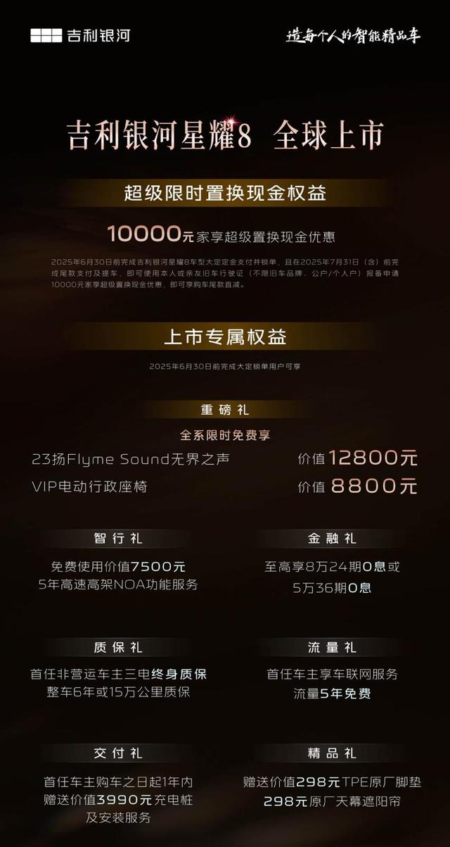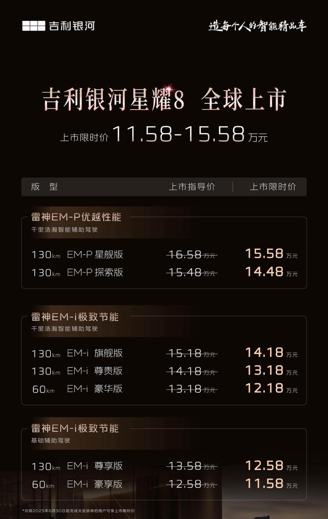 2025年5月9日晚,吉利银河星耀8正式宣布上市,推出7款配置车型,上市限时价11.58-15.58万元。