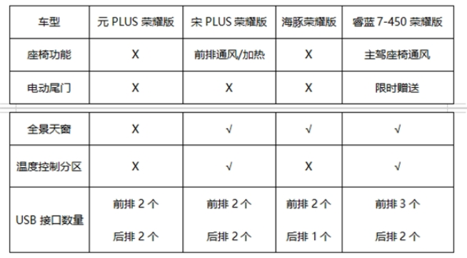 配置的高低,决定了用户在日后用车生活中的品质。在配置方面,睿蓝7-450荣耀版直接打出了“入门即满配”的产品标签。得益于其限时购车福利,睿蓝7-450荣耀版是目前四款车型中唯一配备电动尾门的。不仅如此,它也是11万级的几款荣耀版车型中唯一配备主驾座椅通风的车型,甚至还配备电动腰托——宋PLUS荣耀版虽然配备前排座椅通风/加热,但价格早已来到了15万区间。