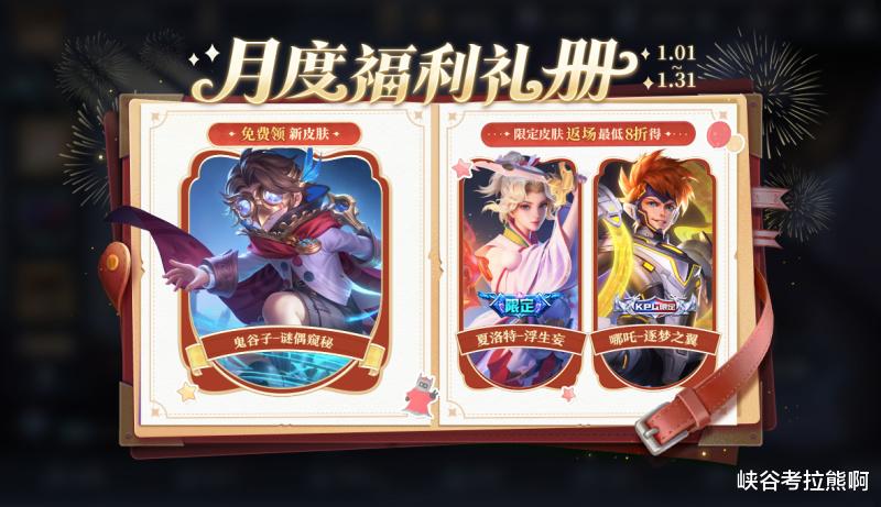 第2款皮肤是鬼谷子的谜偶窥秘,定位勇者。1月1日将正式进入新一期的月度福利礼册,刷新奖励后可概率获取。当然,也可以在2月1日直接在商城以488点券获取。
