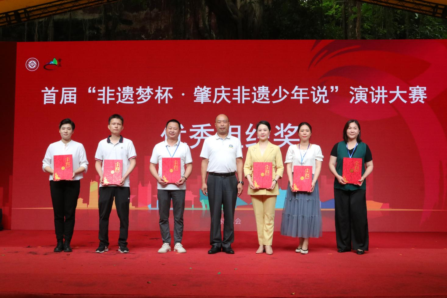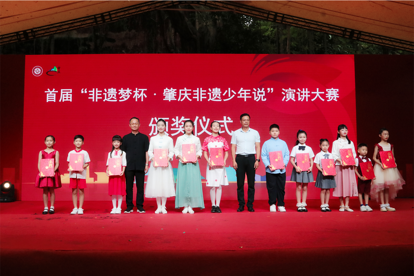 随后进入到备受瞩目的首届“非遗梦杯·肇庆非遗少年说”演讲大赛颁奖环节,获奖选手代表、获奖单位代表分批上台领奖。