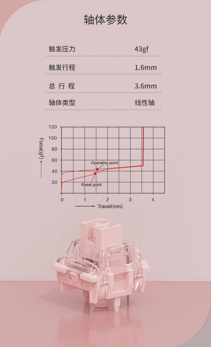 ▲试用一阵下来,跟之前的TTC自家轴体相比,烈焰粉轴从参数到材质上并没有抢眼的突破之处,它自身定位就是一款万金油轴体,所以可以看到从压力、触发行程、总行程都是位于中位数范围,回弹压力也不像烈焰红轴那么强烈,而是跟大部分轴体一样在20gf。其实线性轴体发展这么多年来,中庸,稳定才是常态。TTC为啥会出品这么一款轴体,我觉得可以从搭载它的键盘方面猜想。