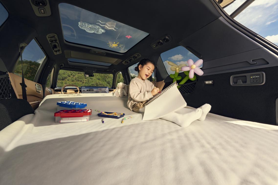 空间方面,5240mm车长与3160mm轴距带来同级最大空间,后备箱基础容积1030L,拓展后可达1215L,搭配80L下沉式储物空间,轻松容纳露营装备、高尔夫球包等大件物品。二排以1120mm腿部空间与1350mm超宽真三座设计实现“舒享平权”,中间座椅标配加热,两侧支持通风与16点按摩,更首创儿童床模式,满足9岁儿童躺卧需求。电动无界天地门设计进一步拓展场景,地门承重300kg,可作为户外观景台或餐桌。