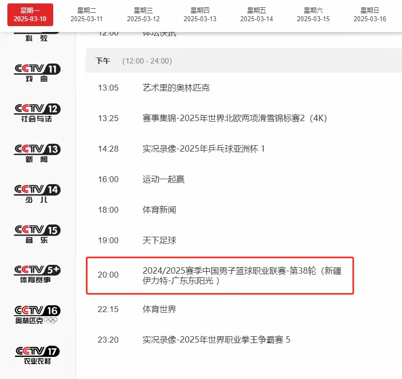 关于10号央视五套CCTV5 . CCTV5+节目表