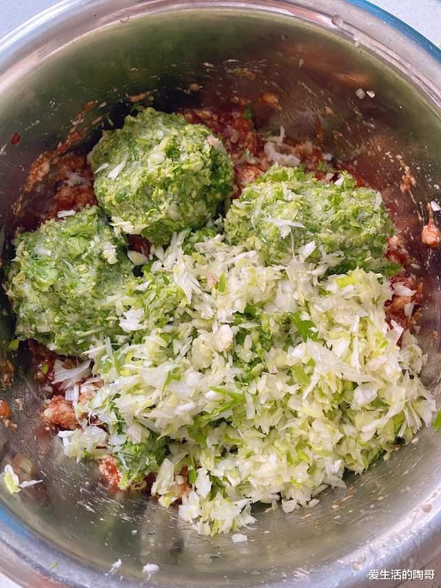 3白菜腌制一会后,把里面的水分倒掉,放进肉末一起