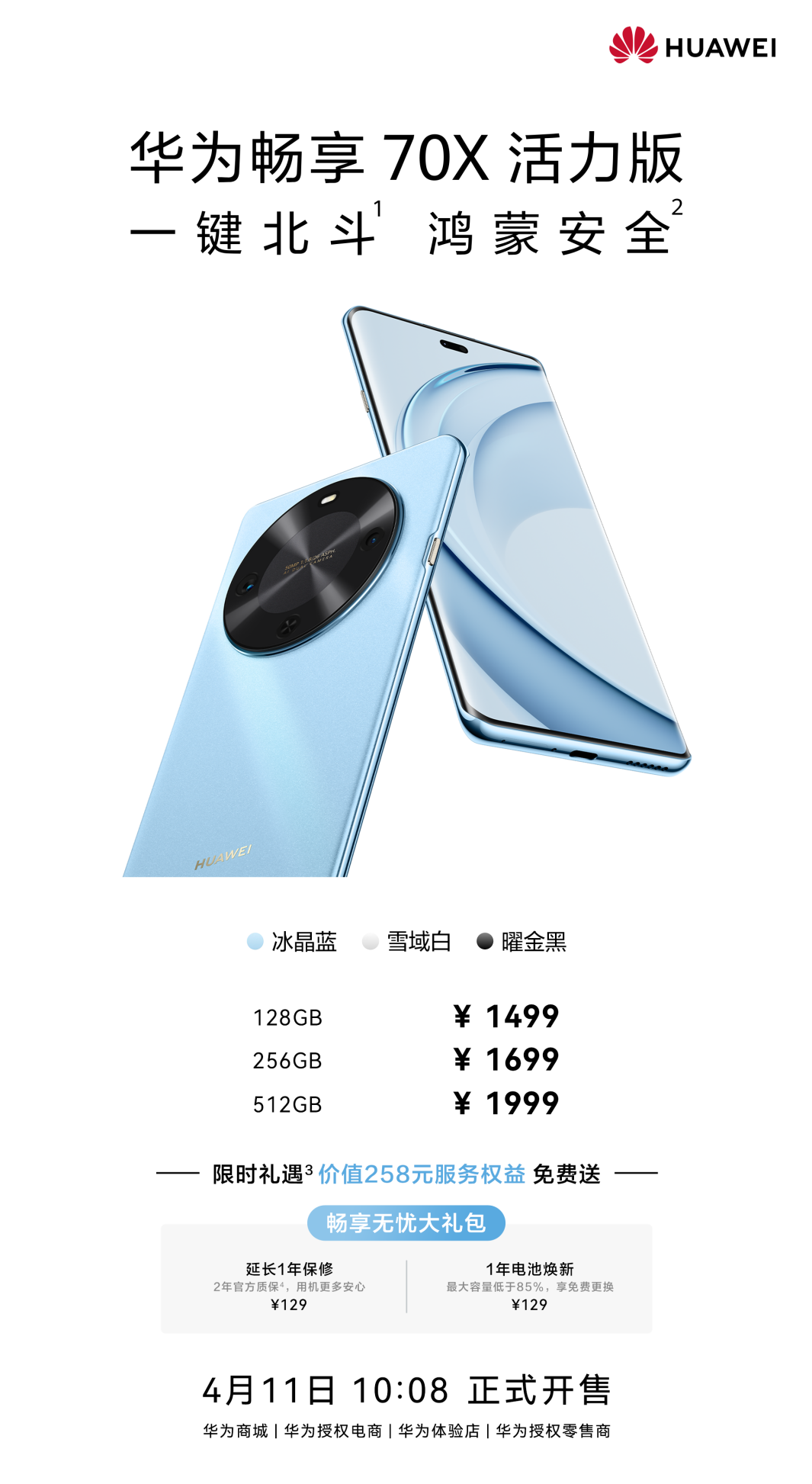 值得一提的是,华为畅享 70X 活力版已正式开售,售价1499元起,国补最高直降300元,最低到手价1274元起即可拥有。不仅如此,2025年4月11日至2025年5月11日,华为畅享 70X 活力版新机用户,可通过我的华为app-新机权益-华为畅享 70X系列新机礼包-畅享无忧大礼包领取礼遇,包含延长1年保修和1年电池焕新,更多服务权益详情可通过我的华为app-服务-权益查询了解。