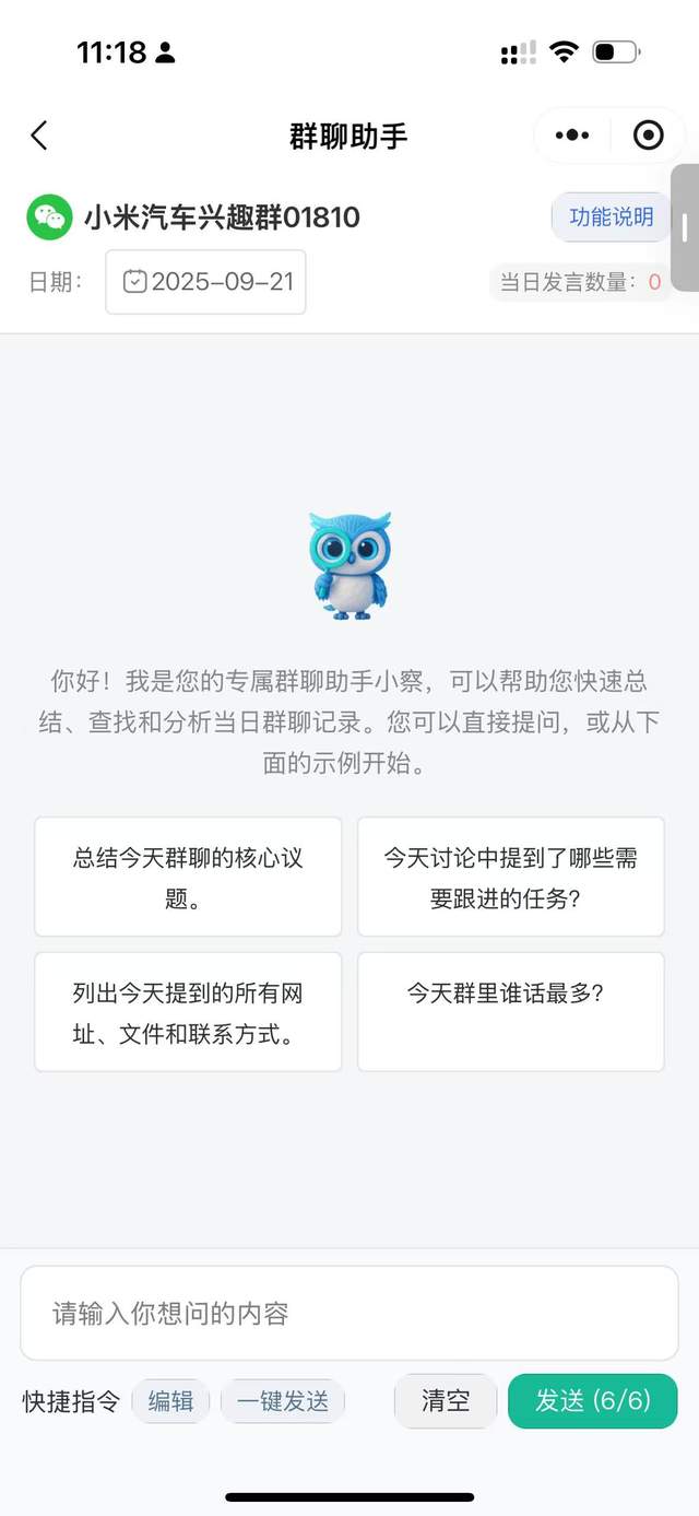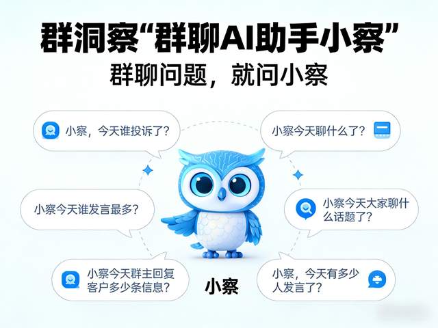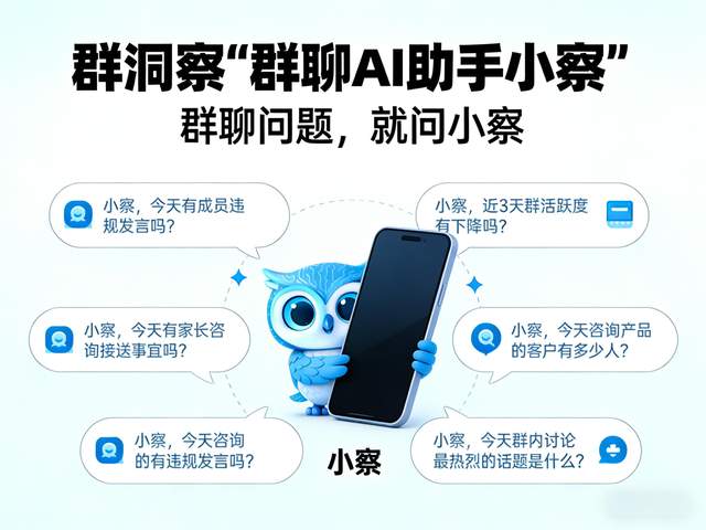 如何使用“小察”进行群聊管理?“小察”的核心功能是通过简单的对话,让群主快速获取群内的重要数据。以下是几种典型的应用场景: