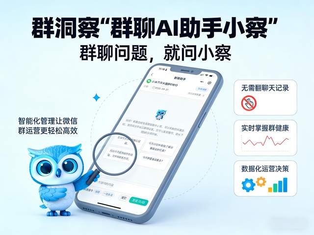 在微信群管理中,群主和运营者面临着大量的聊天记录和成员互动,如何高效地处理这些信息,成了运营者的一大难题。群洞察推出的群聊助手“小察”利用AI技术,通过对话式的方式帮助群主和运营者快速获取群内的运营数据,让群管理变得轻松高效。