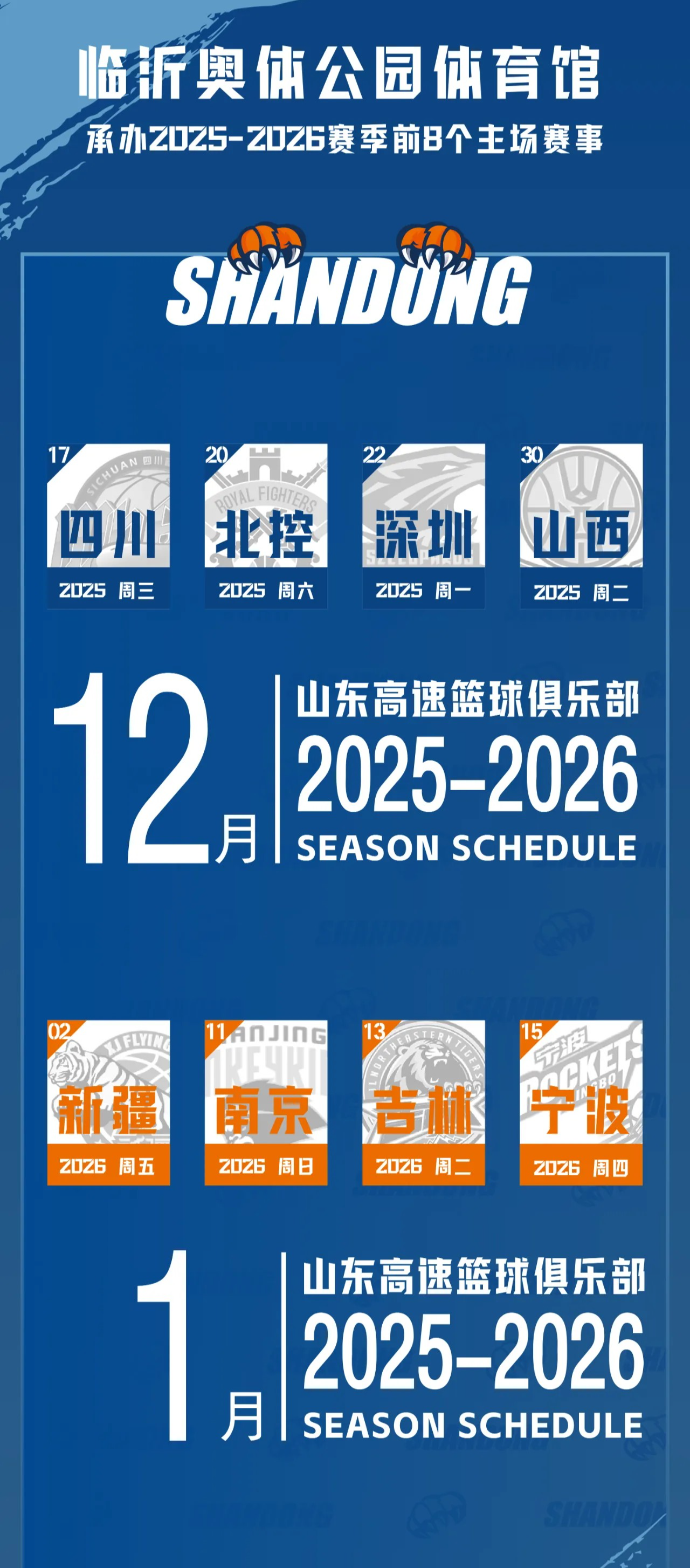 2025-2026赛季山东高速男篮主场前8场赛事在临沂分赛区举行,新赛季主场揭幕战球票将于2025年12月6日11点正式发售。首场比赛山东男篮对阵四川男篮,这场比赛拿下开门红的问题不大,四川男篮到现在都没有签约外援,而且休赛期他们也经历了很多的变故,双方的整体实力并不在一个层面上。
