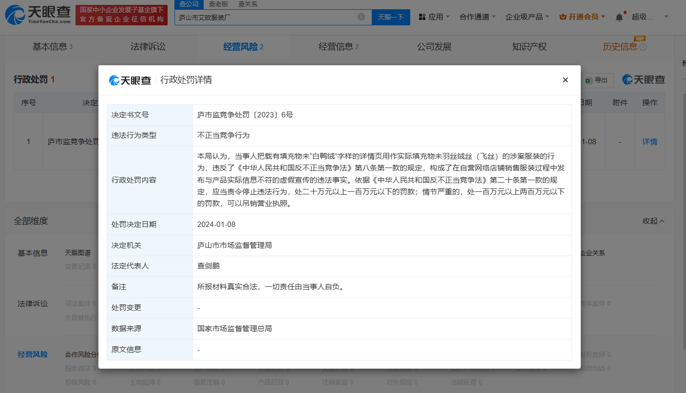 另据了解,此前,庐山市君顺莱服饰有限公司、庐山市艾欧服装厂均因把载有填充物为“白鸭绒”字样的详情页用作实际填充物为飞丝服装的行为,被市场监管部门处罚。