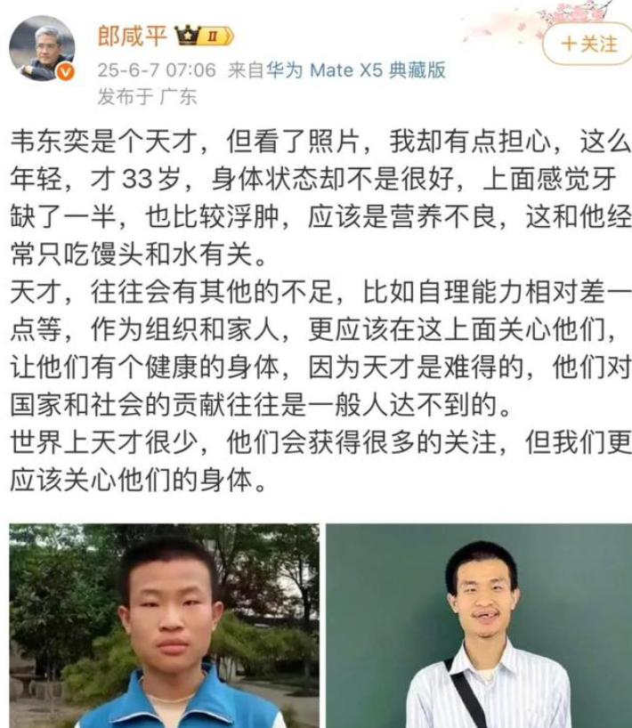 更揪心的是韦神的健康问题。长期素食导致牙周炎恶化,脱落的牙齿成了网友"云监工"的焦点。堂姐透露:"去年陪他治了两次,今年暑假必须再治。"但北大数学院已明确表态:希望暂停账号更新,让学者回归学术本位。