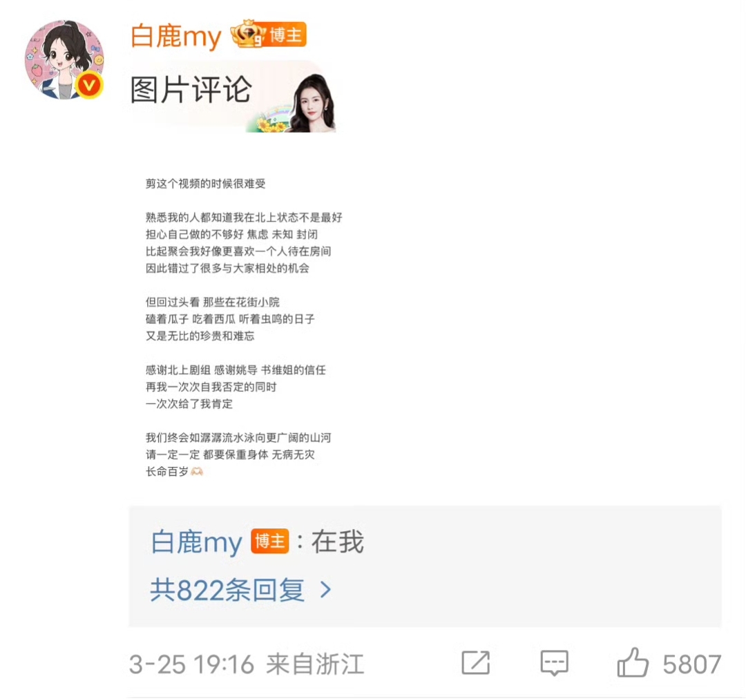 白鹿回应了,粉丝会心疼姐姐因为这么点小事就道歉。