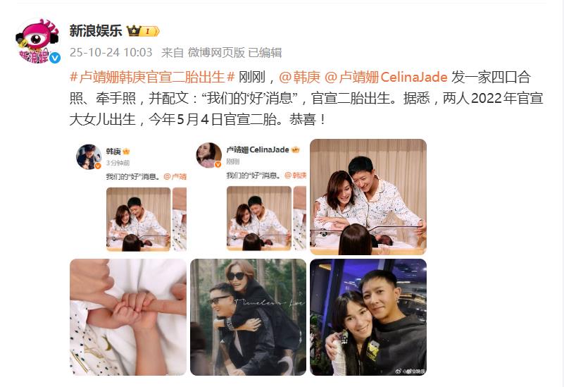这回,韩庚和卢靖姗直接给娱乐圈扔了个“完美剧本”!2025年10月24日,两人在微博同步官宣二胎出生,一句“我们的‘好’消息”,配上全家四口牵手照,瞬间引爆热搜——这“好”字一出,明眼人都懂了:儿女双全,凑成个“好”,恭喜升级四口之家!