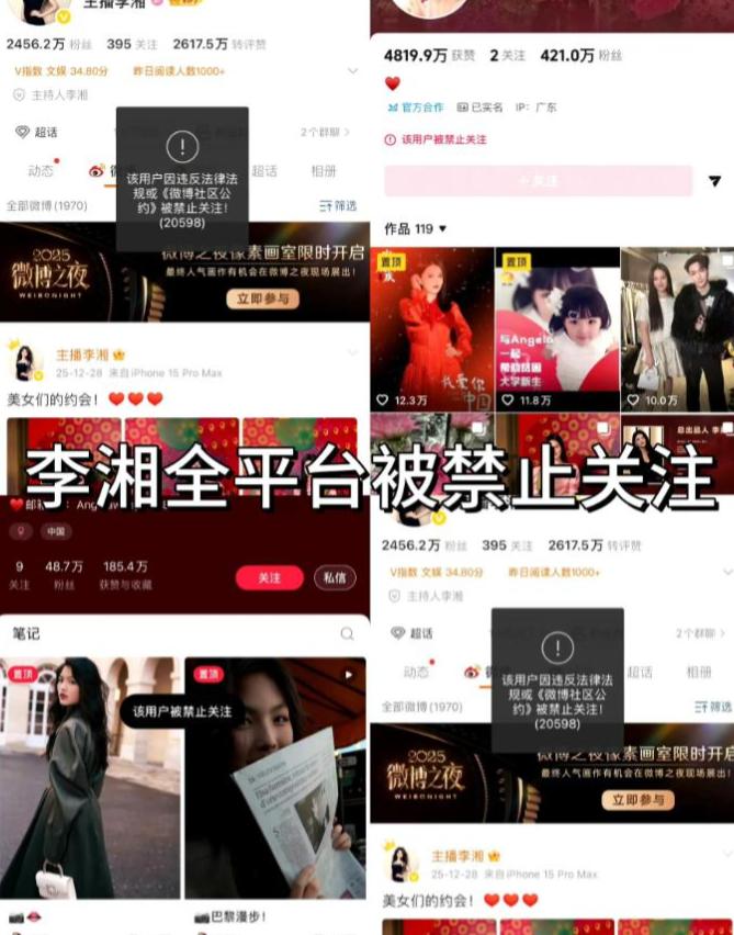 1月16日,李湘的微博、抖音、小红书等全平台账号突然被“禁止关注”,平台统一提示“违反法律法规或社区公约”。