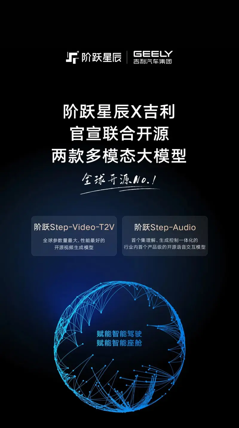 在当今时代,科技浪潮正以前所未有的速度推动各行业变革,汽车产业与人工智能的融合更是成为发展的必然趋势。2025 年 2 月 18 日,汽车与 AI 领域迎来一则重磅消息,吉利汽车集团和阶跃星辰携手,正式向全球开发者开源两款阶跃 Step 系列多模态大模型。这一行动在技术发展进程中意义非凡,为汽车行业的智能化转型注入了新的活力,也为全球 AI 技术的发展添砖加瓦。