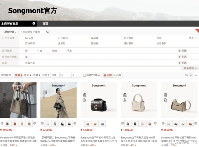 从山下有松天猫店的的成交上,我们可以看出消费者对国产高端女包的期待集中在“实用”和“质价比”上,比如山下有松起源的托特电脑包、卖的最好的hobo和菜篮子 这些款式或是轻便容量大方便通勤,或是皮质款价格在1000-3500元左右,相较于国外轻奢包来说质价比有一定优势。