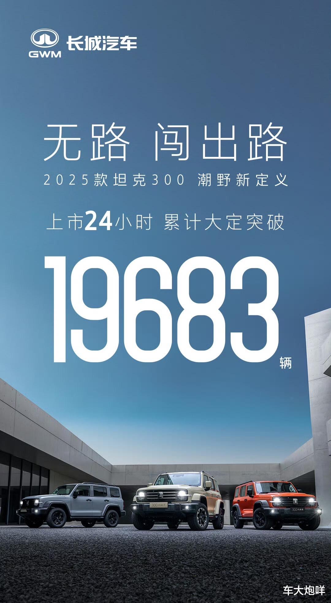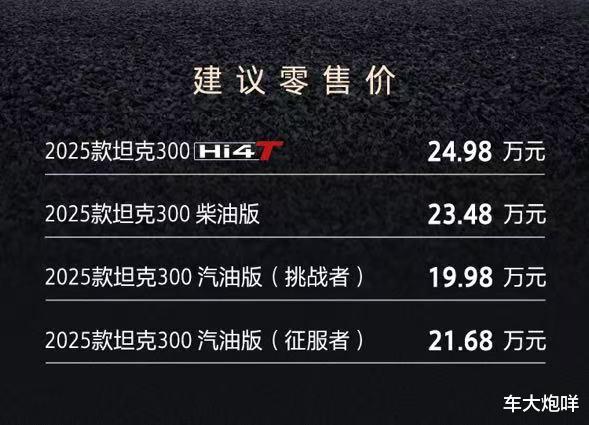 作为年代改款版本,2025款坦克300已于3月10日正式上市,提供汽油版、柴油版、Hi4-T插电混动版给消费者选择,官方指导价格区间为19.98万-24.98万元。而日前笔者从长城坦克品牌官方获悉,2025款坦克300上市24小时累计大定突破19683辆。
