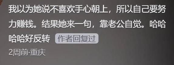 我原以为接下来她会提到自己非常独立,并依靠自己的努力来赚取生活费,没想到她却说,我认为这种事情有时需要依赖男人的自觉,还要看老公的态度。我也不喜欢主动去索要,所以从来不强求,只希望他能够懂得分寸。