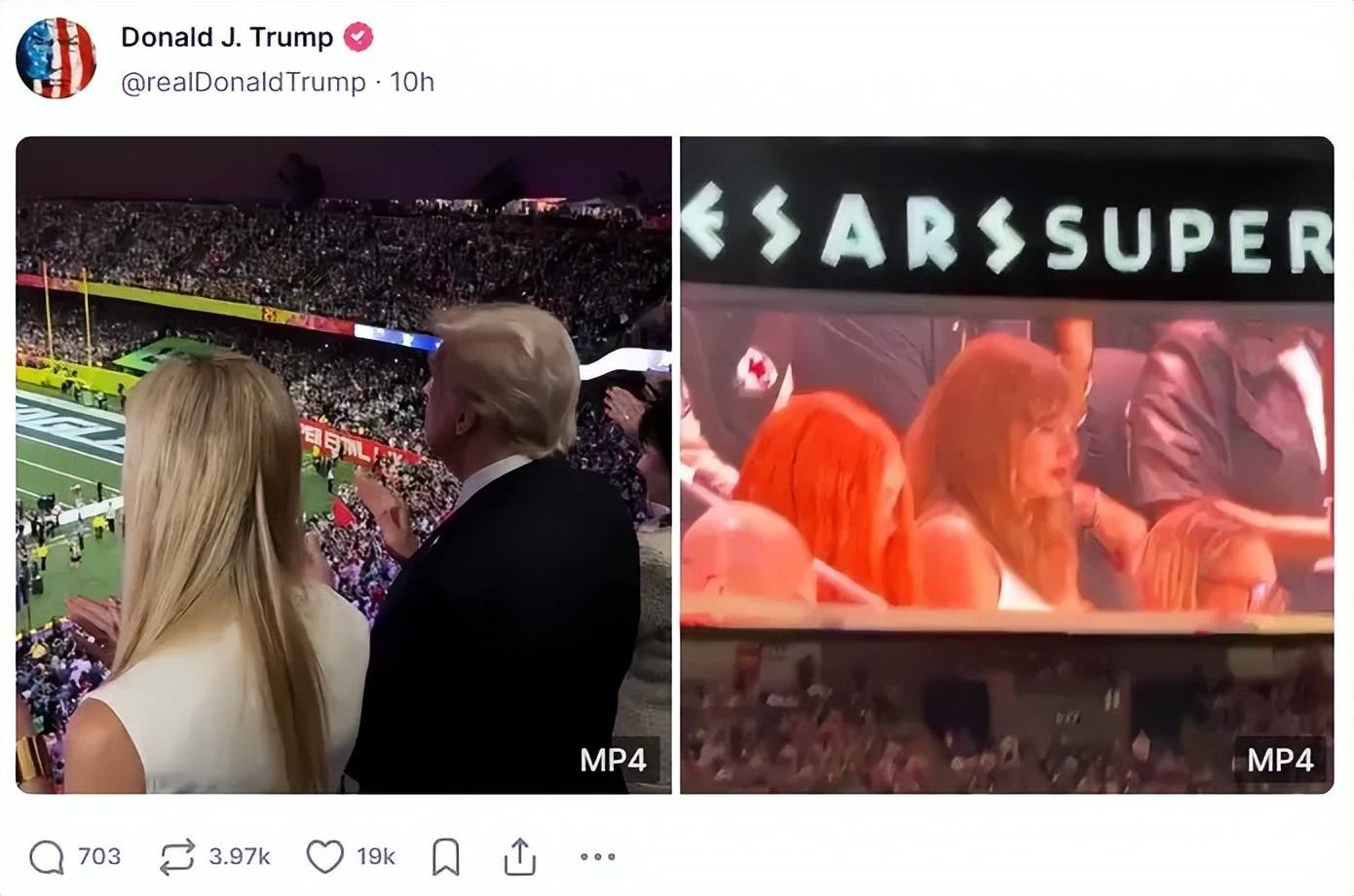 特朗普还洋洋得意,转发一条推文说:“特朗普在超级碗上得到了盛大的欢迎,而霉霉被嘘了——这个世界正在愈合!”