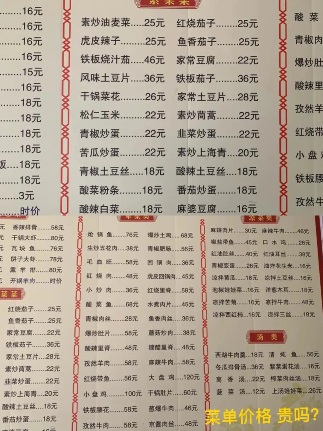 关于吃饭:我在路边一家小饭店吃的,拌面16元,份量足,味道不错。青椒土豆丝18元,回锅肉36元,小炒肉36元,酸菜鱼68元。都说看一个地方物价贵不贵,看看土豆丝的价格就知道,你们觉得贵吗?