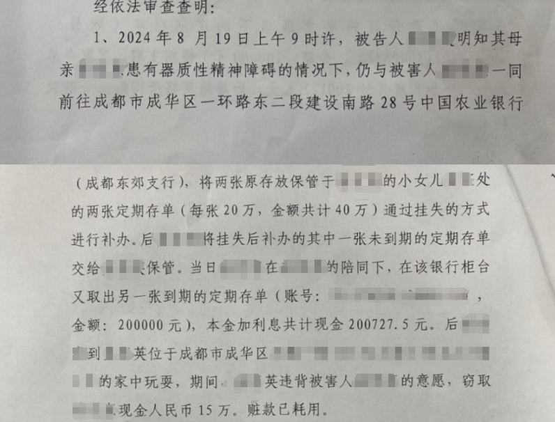 "我母亲连亲闺女都认不得,却记得存折密码!"四川成都的黄女士含泪控诉,自己将84岁患老年痴呆的母亲送进养老院,却遭数十年未联系的大姐多次私自带出,用假身份证调包真证,分两次取光母亲40万养老钱。法院认定盗窃却因"家庭矛盾"免刑,养老院更被曝隐瞒真相、纵容违规!这场亲情与利益的博弈背后,暴露的是法律盲区还是监管黑洞?