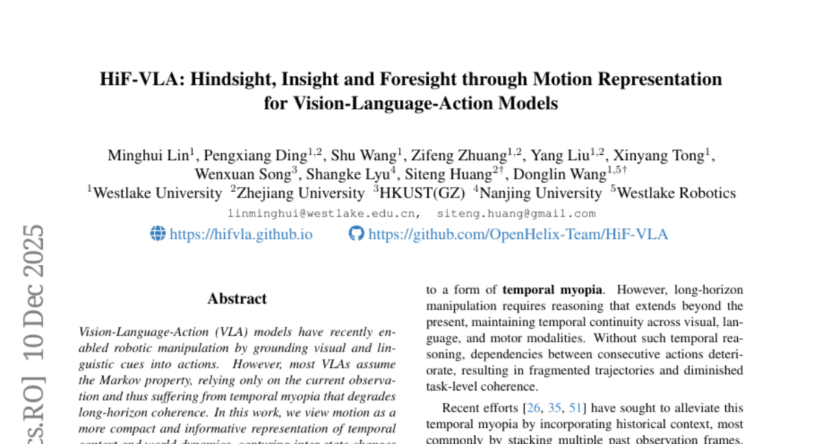 西湖大学的研究团队深刻认识到了这个问题。他们发现,现有的机器人虽然能够理解视觉信息和语言指令,但在执行需要多个步骤的复杂任务时经常会失败,原因就在于这些机器人缺乏时间记忆能力。研究团队提出了一个革命性的解决方案:HiF-VLA(Hindsight, Insight, and Foresight for Vision-Language-Action Models),这个名字听起来很复杂,但其实就是让机器人同时具备"回顾过去"、"理解现在"和"预测未来"三种能力的技术框架。