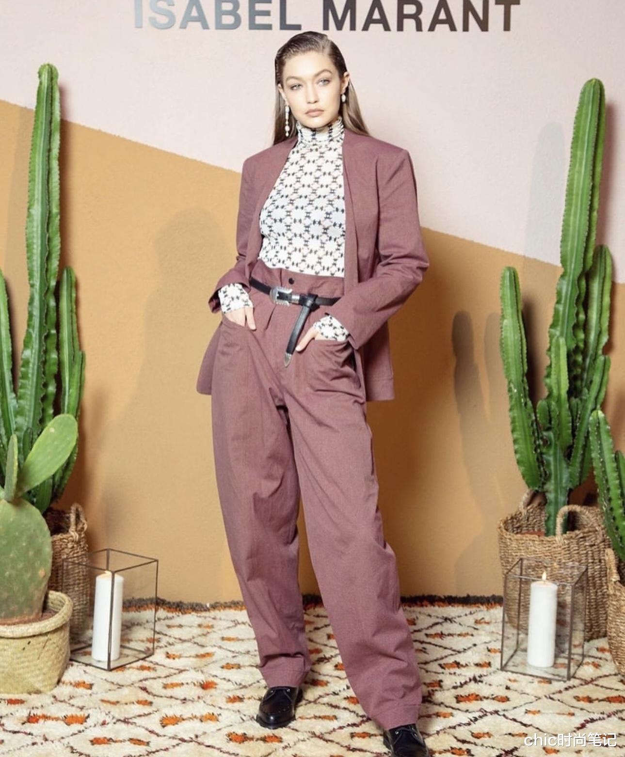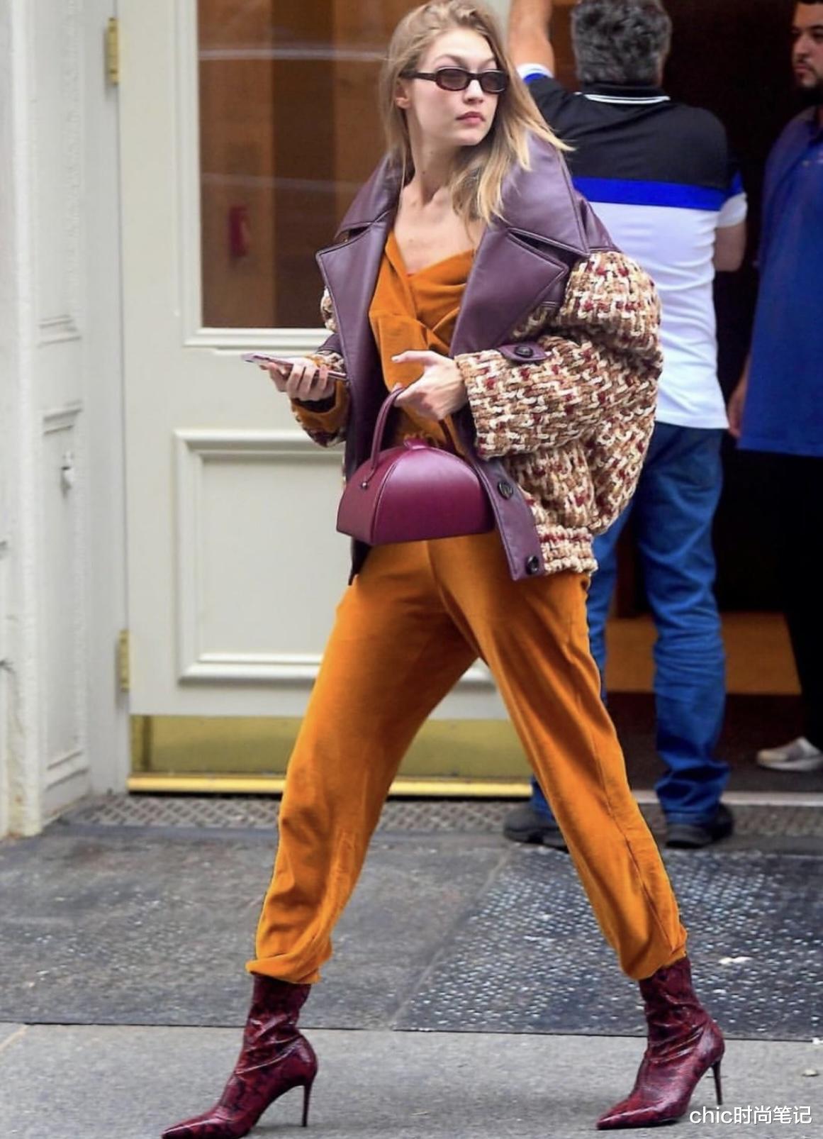 Gigi对亮色系把控的刚刚好,一件橙色连体衣做了褶皱的设计,搭配酒红色皮质高跟靴子和手拎皮包,非常大胆的撞色搭配,外套也是选择同色系的机车服,整体look又飒又有气场。