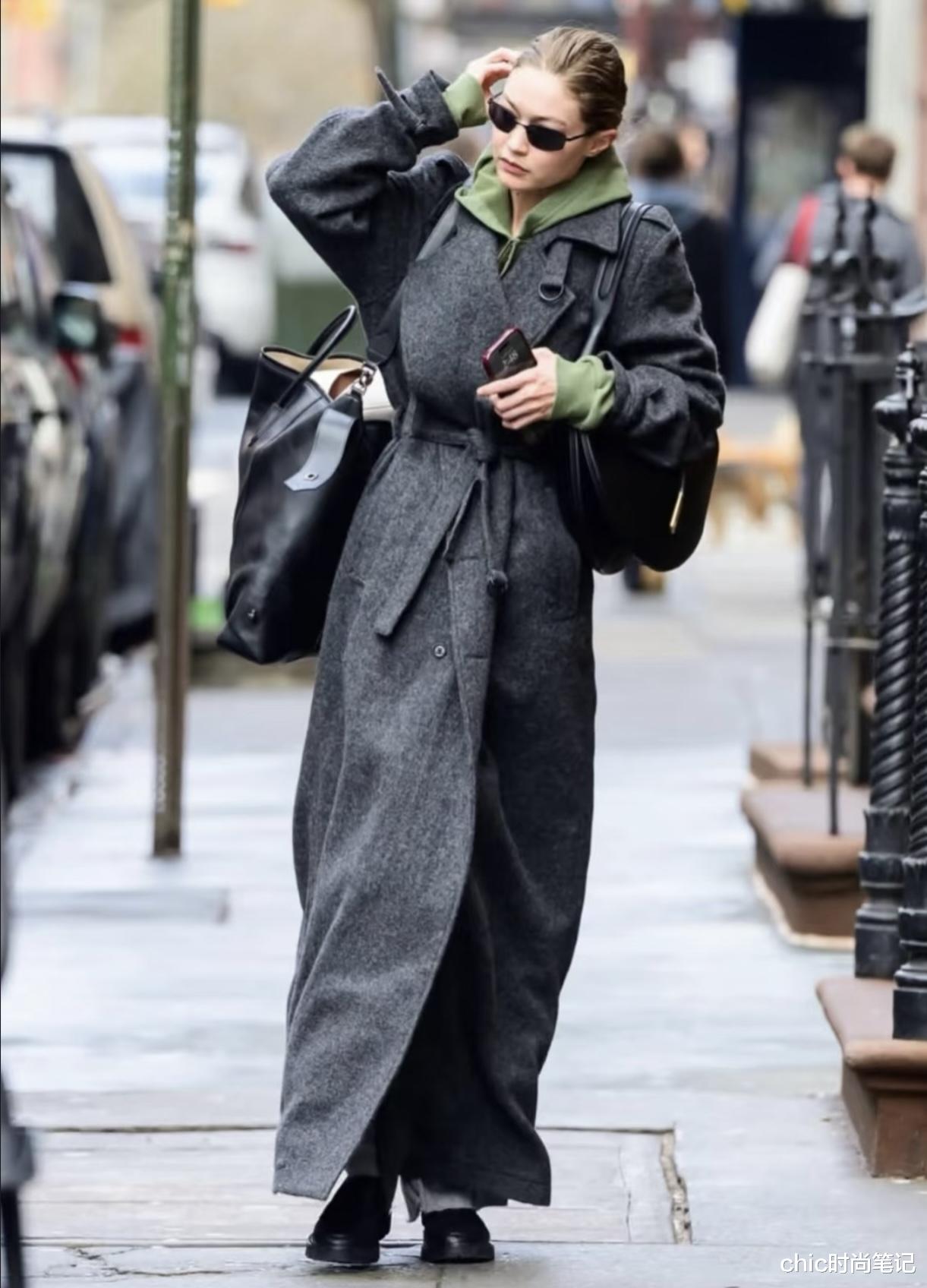 一身身雾蓝色长款风衣与超模出生的Gigi适配度极高,搭配的是浅色系牛仔裤和德训鞋,用一件花色条纹针织衫作为穿搭点缀,既有层次感,又能穿出街拍的时尚style。