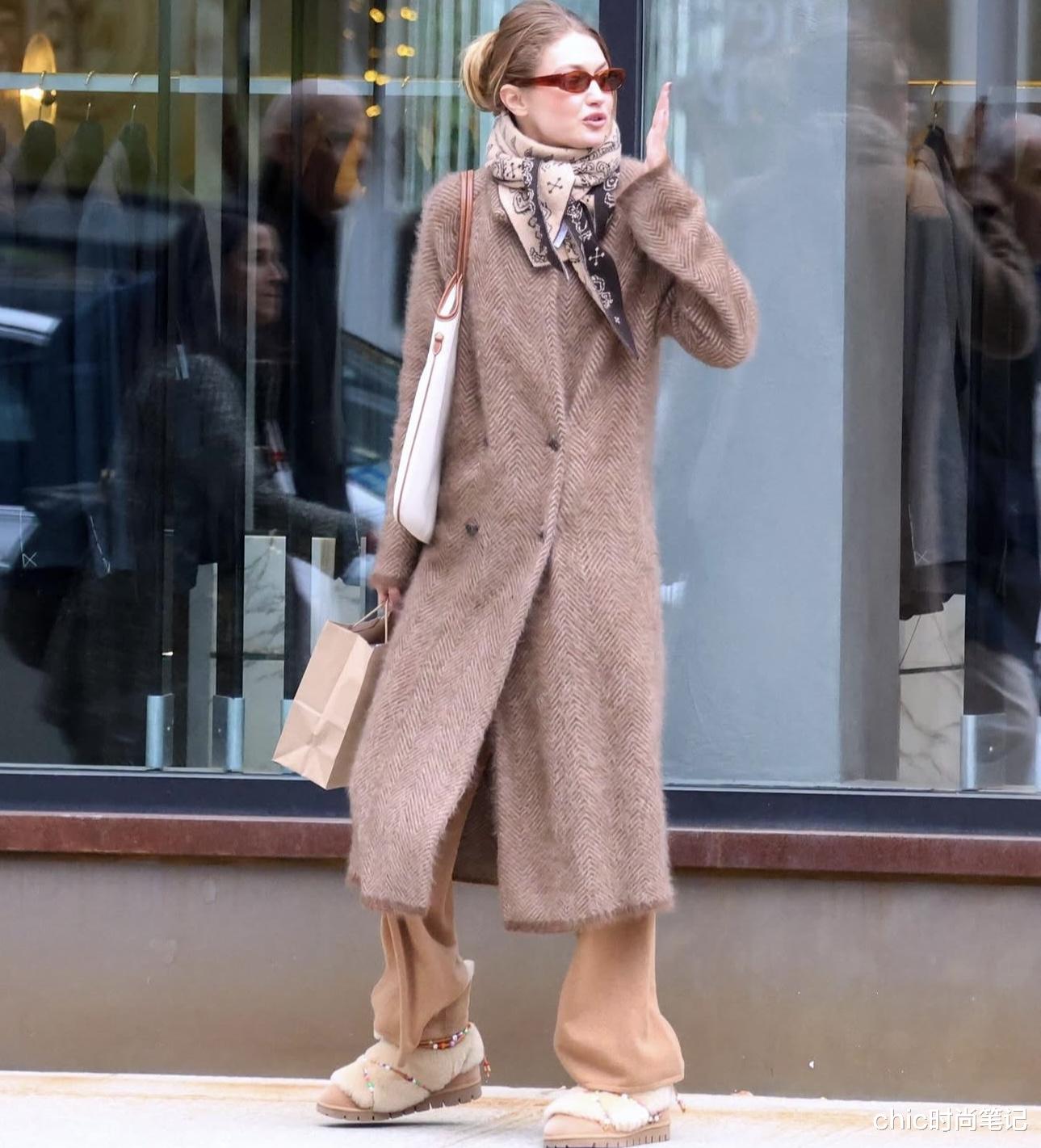 棕色马海毛大衣搭配的是卡其色毛呢裤,用棕色系的单品作为时尚点缀,棕黑花色围巾、棕色雪地靴,连墨镜都是棕色系的,简直是把大地色穿在身上了,看着温暖又治愈。