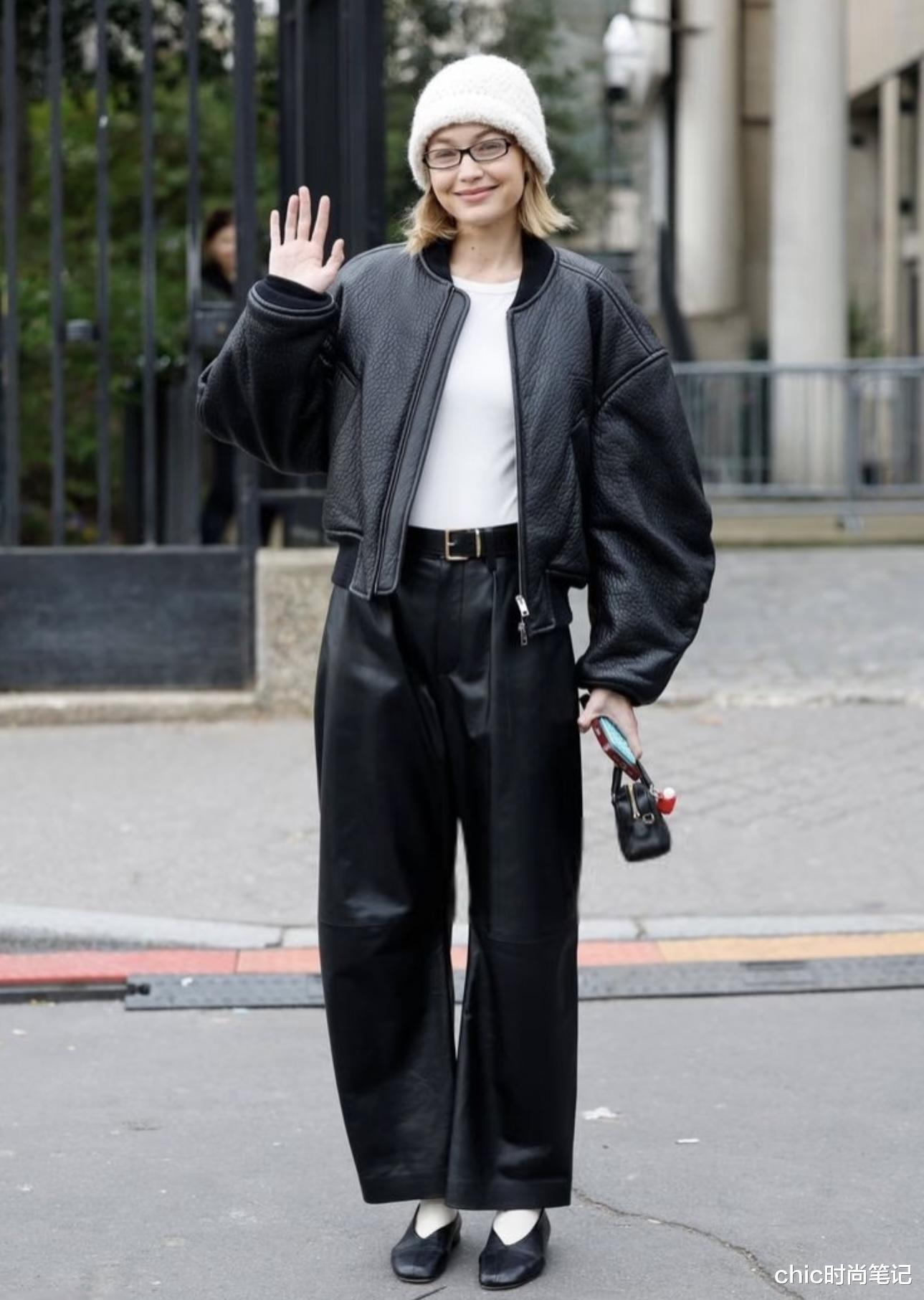 黑色机车皮衣搭配黑色皮裤,allblack的帅气完美呈现,但内搭选择白色T恤,佩戴白色毛线帽,经典的黑白配~