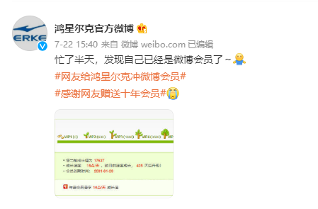 可是,令大家感到疑惑的是,鸿星尔克的官微竟然还不是会员的,看着着实让人心疼,这也一度让广大网友感动不已。