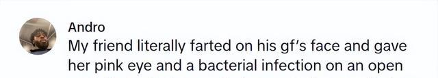 “我一朋友真的对着他女友的脸放了个屁,导致她得了红眼病,还让她的开放性囊肿发生细菌感染,最后不得不做手术。你不是唯一一个遭遇这种事的人。”