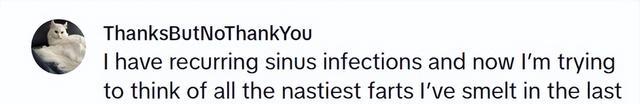 “我一直反复得鼻窦炎,现在我开始回想过去十年里我闻过的最恶心的屁了。”