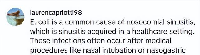 “大肠杆菌是‘医院获得性鼻窦炎’的常见病因,即在医疗环境中发生的鼻窦炎,常发生于鼻插管或鼻胃管插管等医疗操作后。”