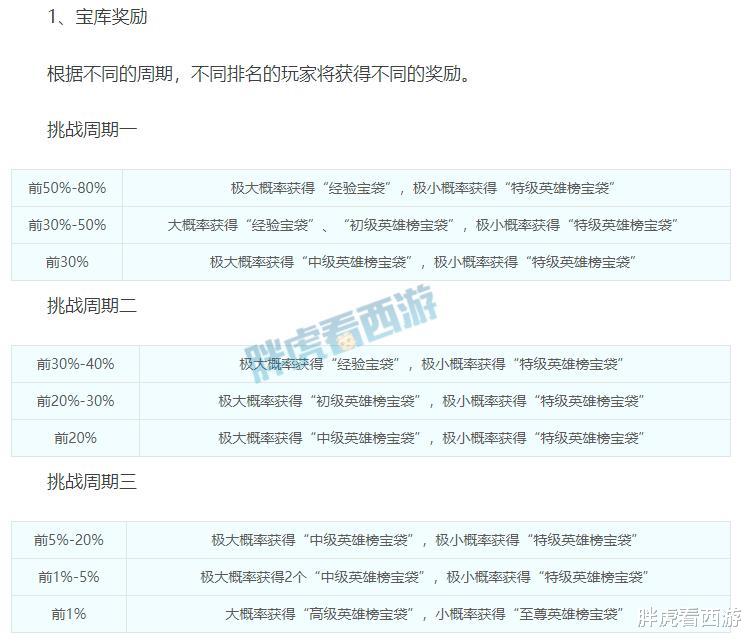 具体排名和奖励是递增的,周期三奖励最好,前1%可以获得至尊和高级英雄宝袋,后续排名可以获得特级、中极等宝袋。