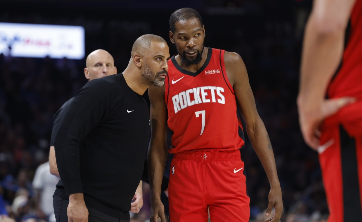 乌度卡一度尝试用防守解决问题,在第二节初摆出过杜兰特+史密斯+阿门+电风扇+谢泼德的四锋线+一后卫阵容,试图通过立足防守,带动进攻,但是防守完全守不住,仅仅两个回合就换回申京,宣告这样的阵容试验宣告失败。