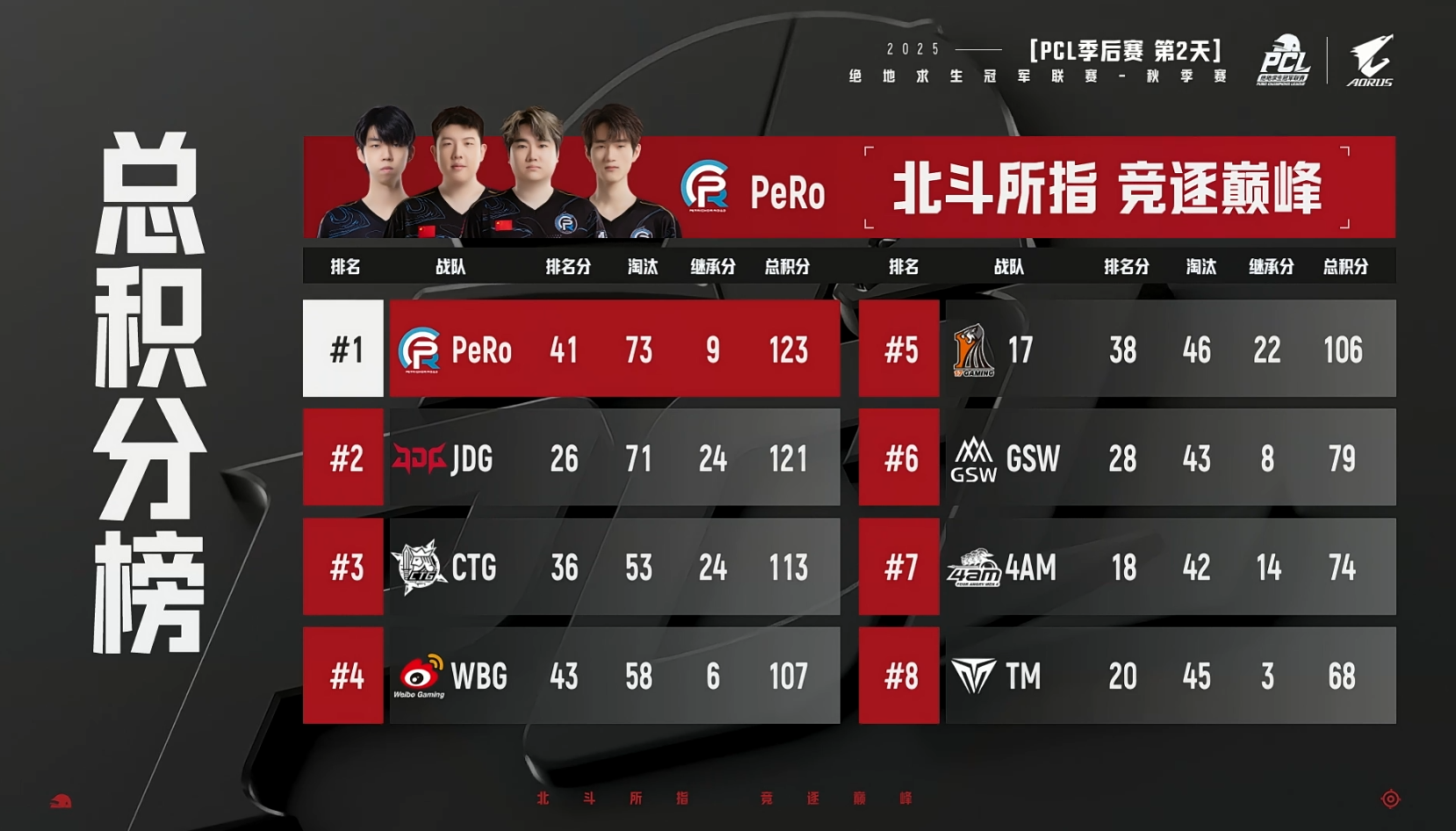 绝地求生PCL秋季季后赛第二天的比赛即将结束,在刚刚倒数第二场比赛17再度吃鸡后,已经有PeRo,CTG,JDG和17四支队伍总分破百,第五名92的WBG前后断档都很大,他们身后的GSW仅有78分,4AM状态不佳排名逐步下滑,只能勉强保住前八。