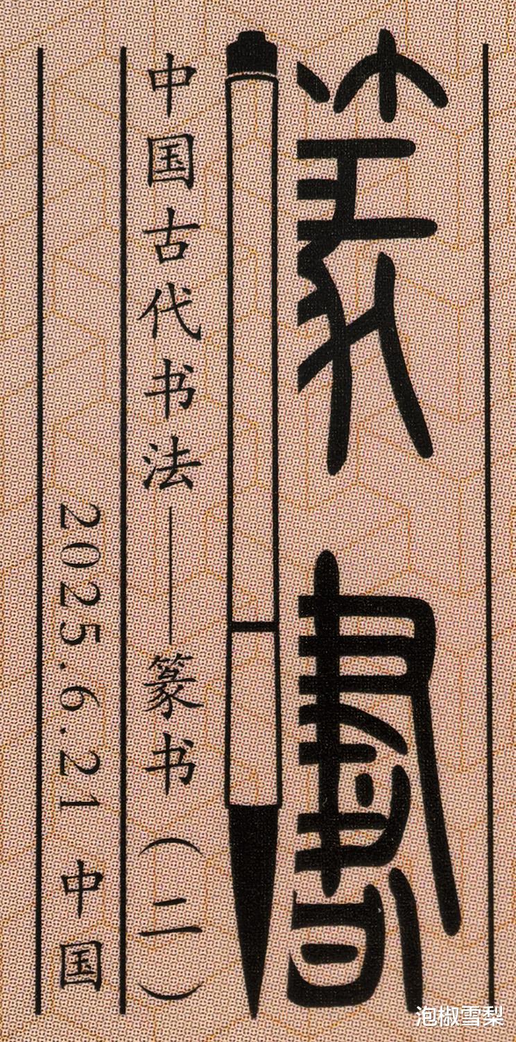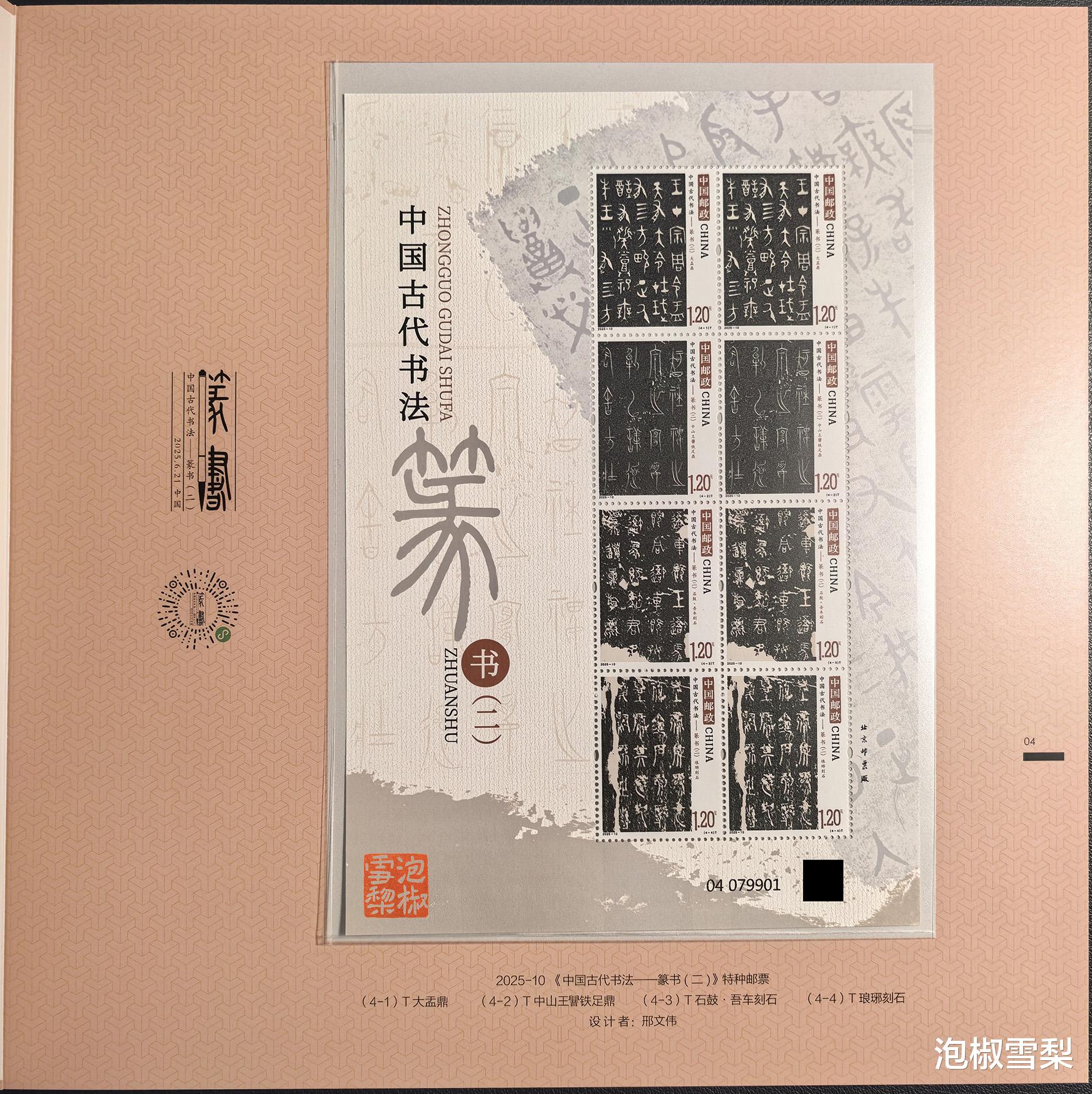 第四页为2025年第10套邮票《中国古代书法—篆书(二)》版式二,小版左边印有首日纪念戳和二维码,下部为套票名称、每枚名称和设计者邢文伟。