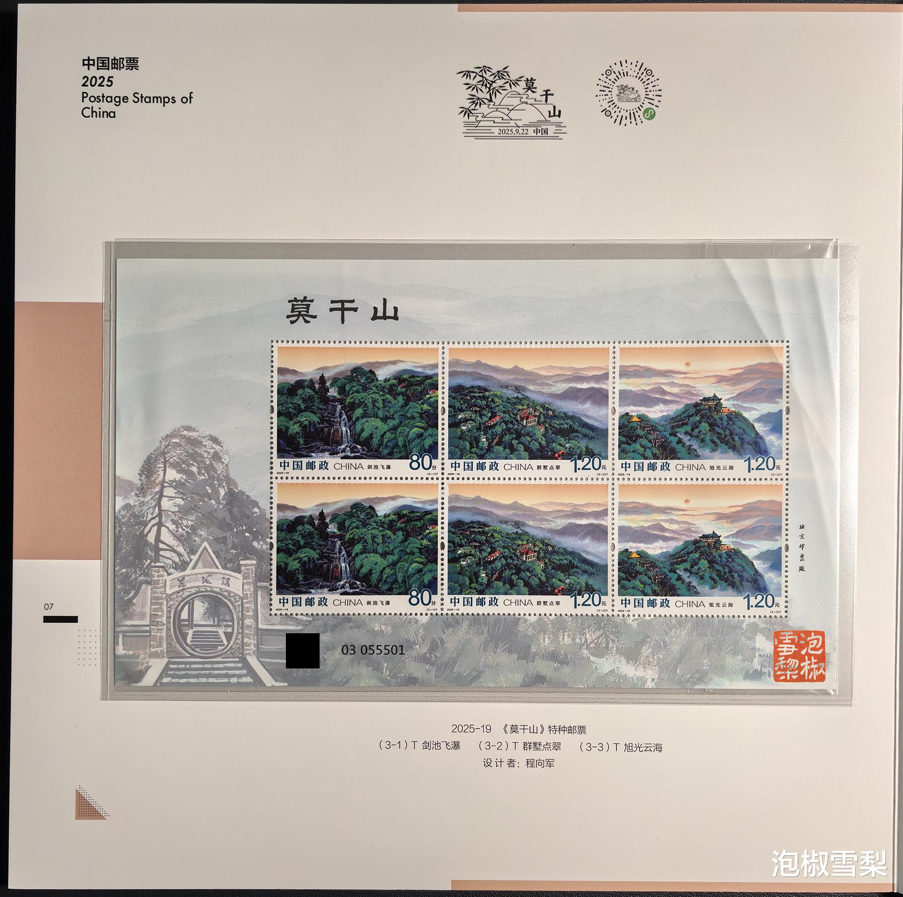 第七页为2025年第19套邮票《莫干山》版式二,小版上部印有首日纪念戳和二维码,下部为套票名称、每枚名称和设计者程向军。