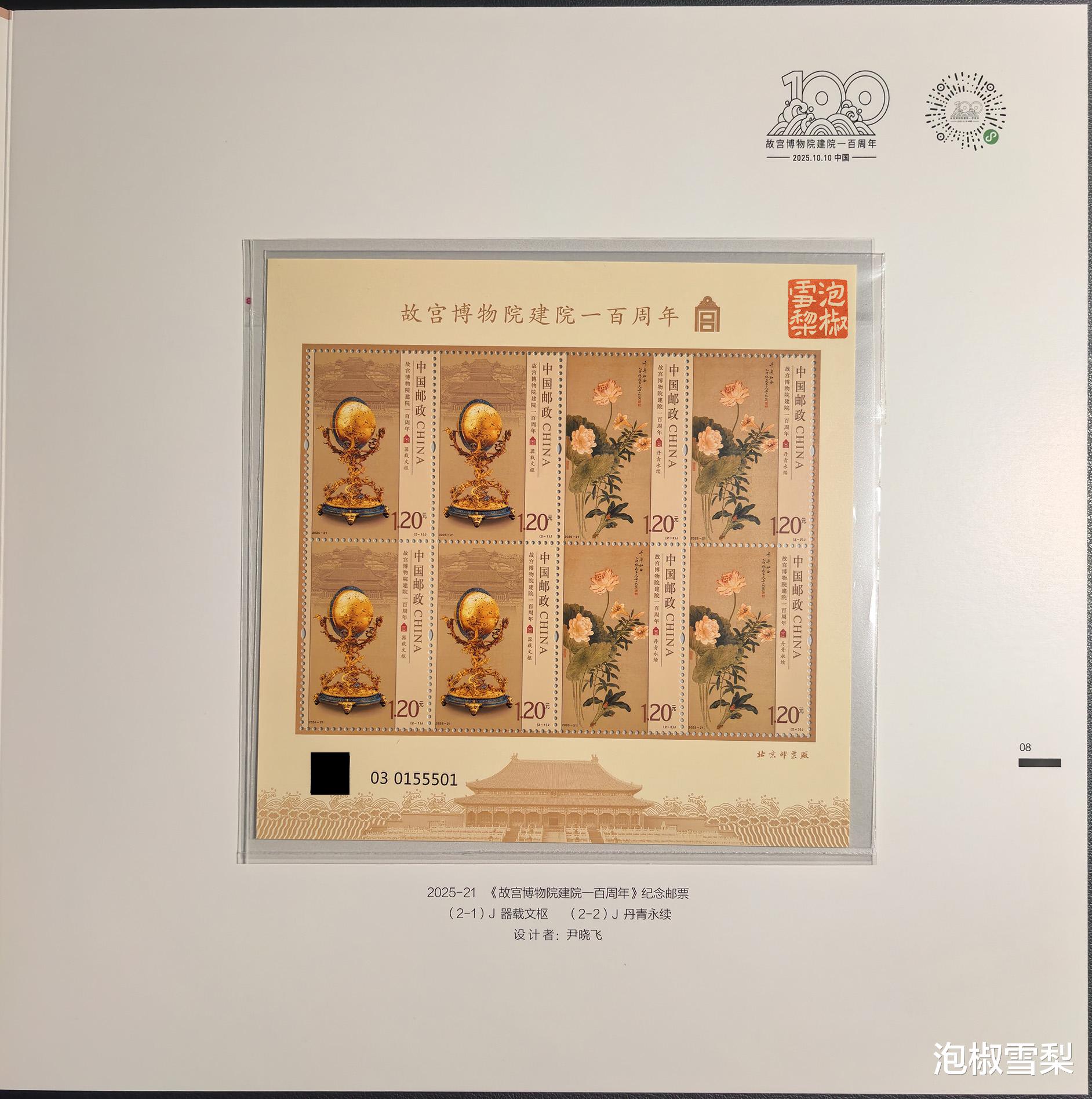 第八页为2025年第21套邮票《故宫博物院建院一百周年》版式二,右上角印有首日纪念戳和二维码,下部为套票名称、每枚名称和设计者尹晓飞。