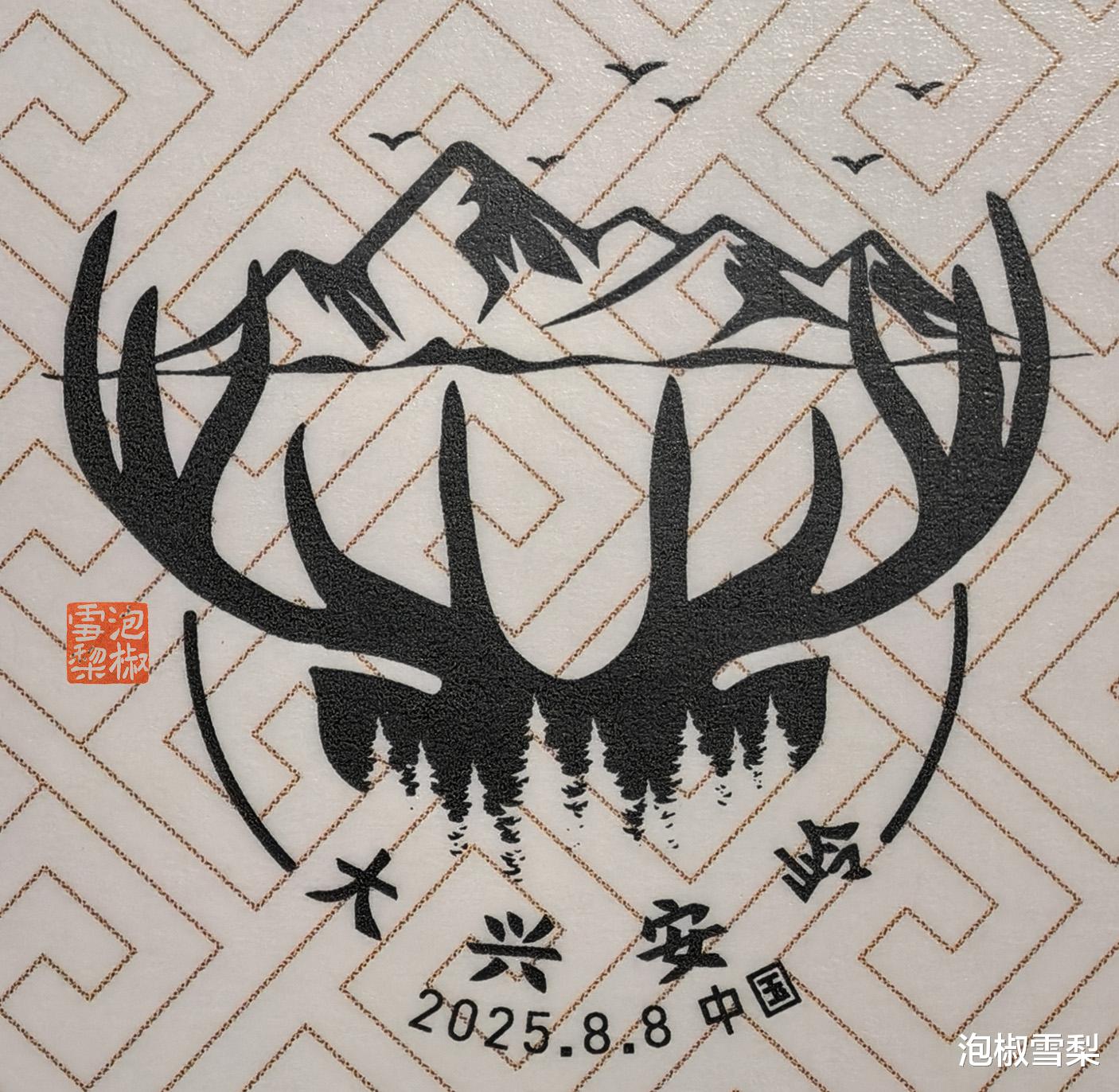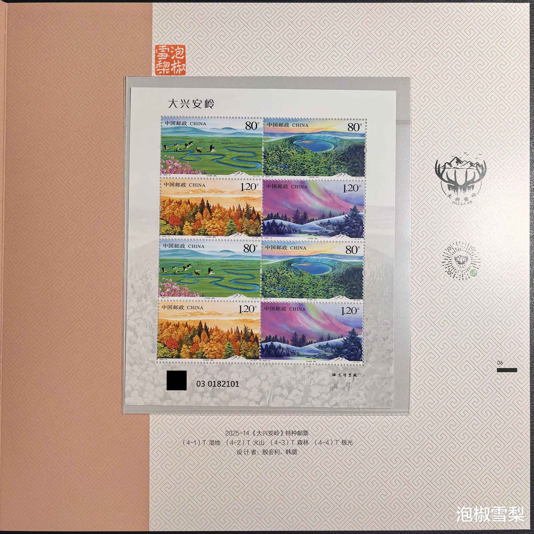 第六页为2025年第14套邮票《大兴安岭》版式二,右侧印有首日纪念戳和二维码,下部为套票名称、每枚名称和设计者殷会利、韩璐。