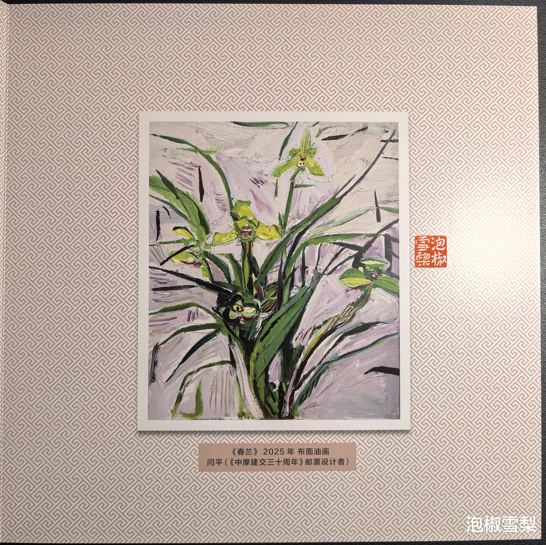 翻开扉页为2025年第22套邮票《中摩建交三十周年》第一图“春兰”布面油画原画稿。
