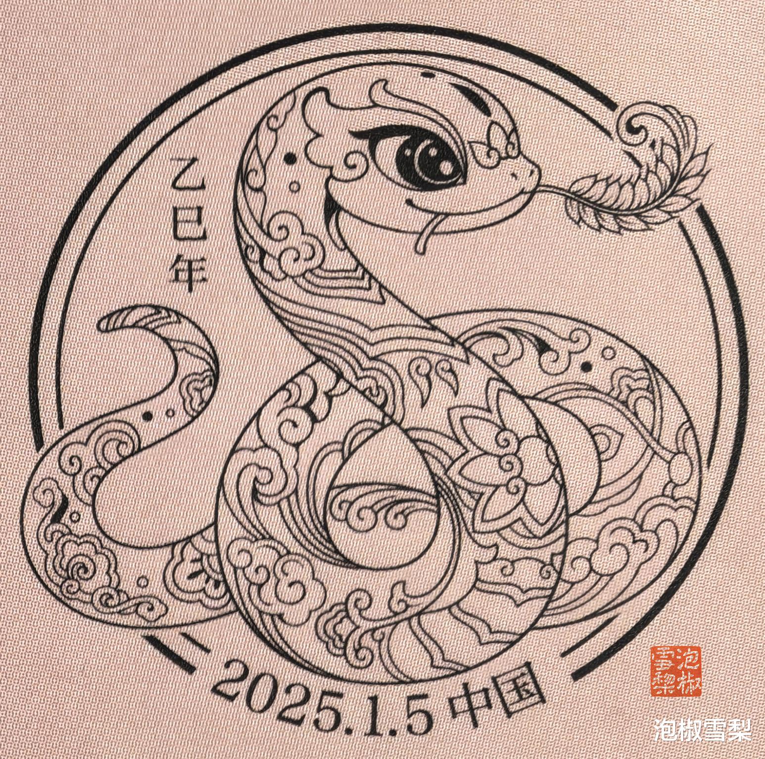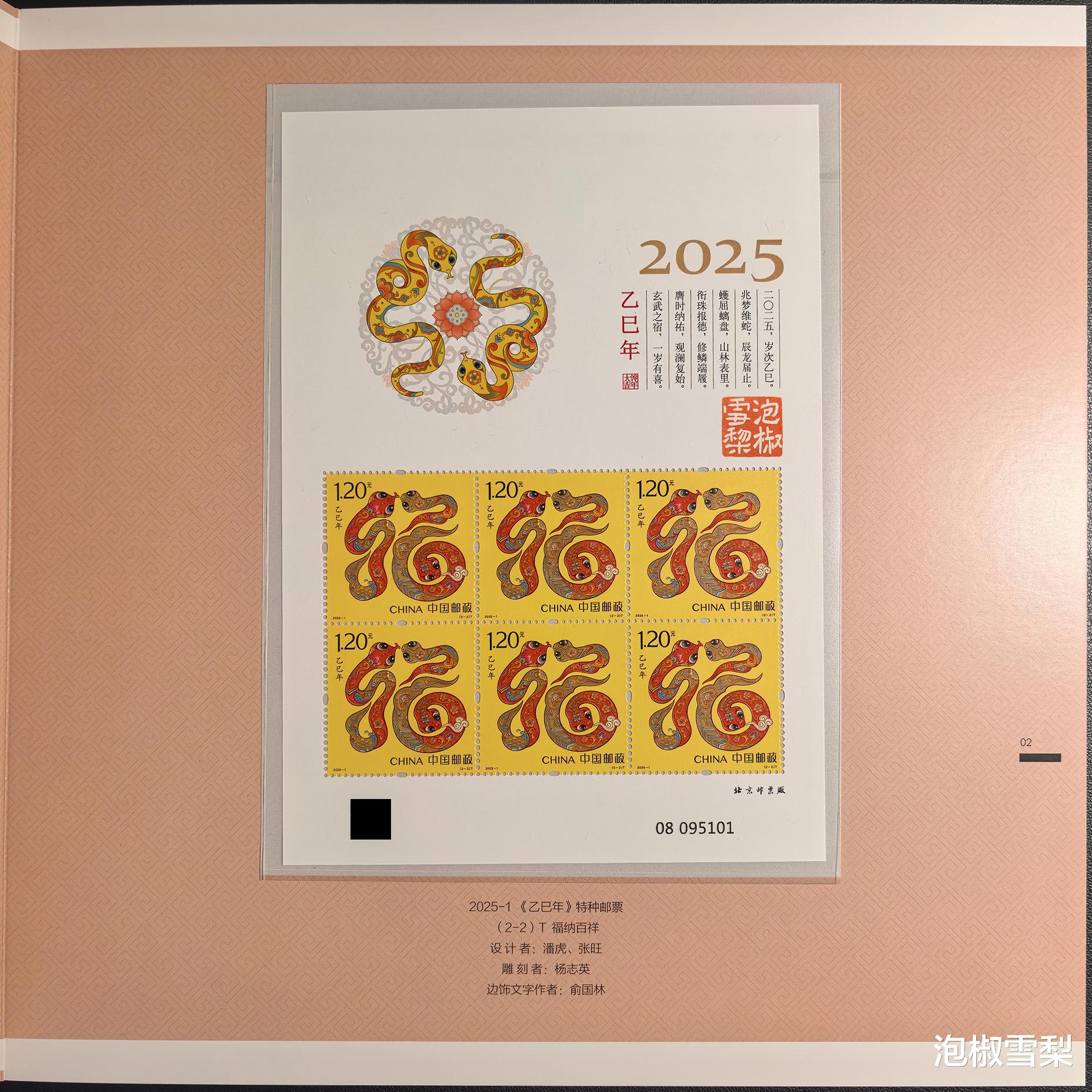 第一、第二页是《乙巳年》生肖版式二,页面上没有背景资料介绍,仅小版的下方印有套票名称、单枚名称、设计相关人员以及边饰作者。