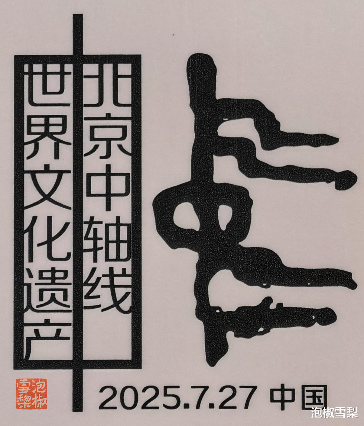 第五页为2025年第12套邮票《世界文化遗产—北京中轴线》版式二,小版左边印有首日纪念戳和二维码,下部为套票名称、每枚名称和设计者王虎鸣。